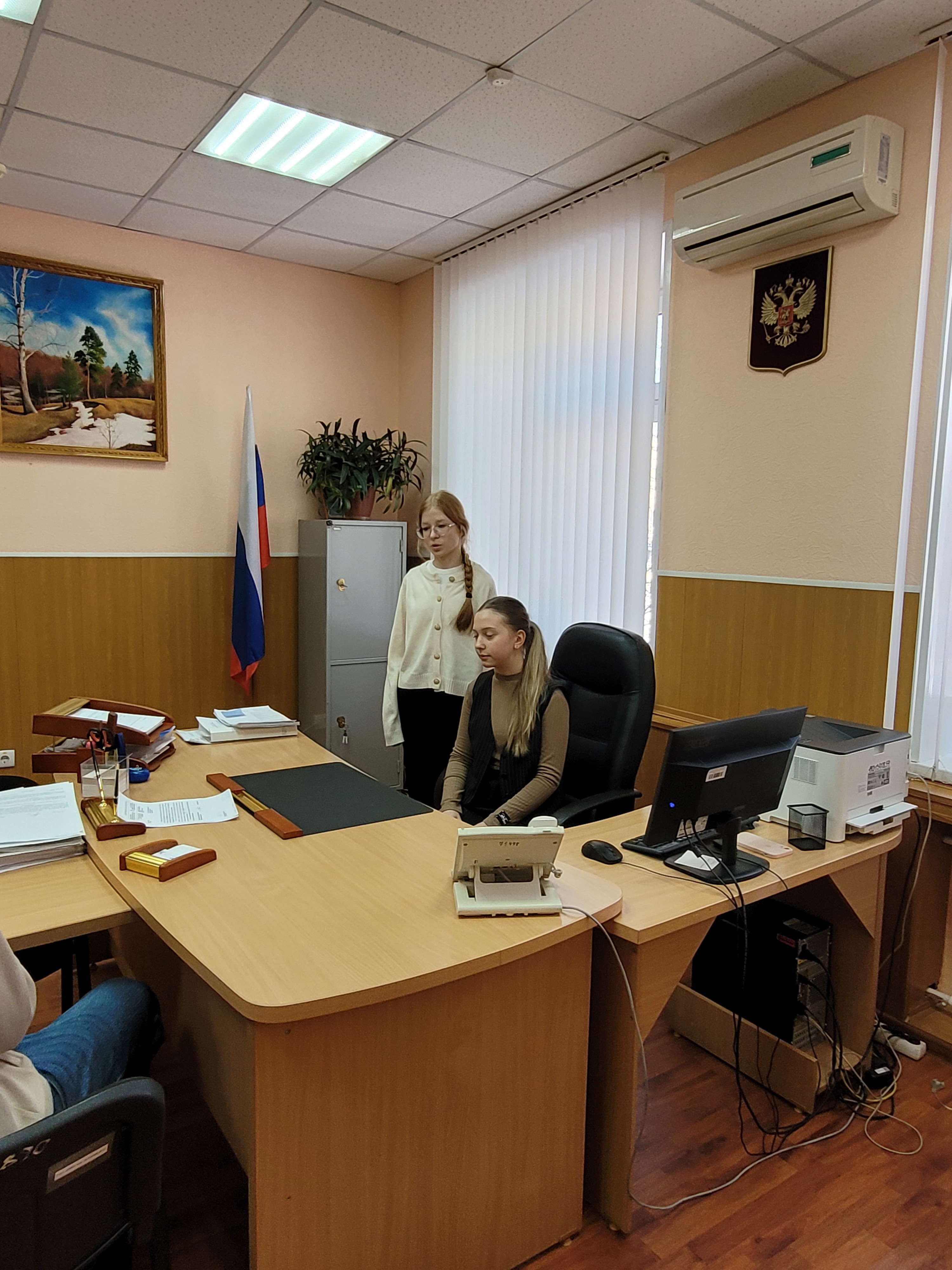В рамках экскурсии, не мешая рабочему процессу, школьникам разрешили снять общие планы зала судебного заседания, рабочего кабинета судьи и смоделировать некоторые моменты для их познавательного видео.